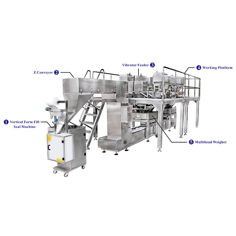 Sistema que incluye : alimentador vibrador, transportador de cangilones en Z, plataforma de trabajo, pesadora multicabezal, máquina formadora, llenadora y selladora Verticl, transportador de productos terminados, detector de metales con cuentagotas.